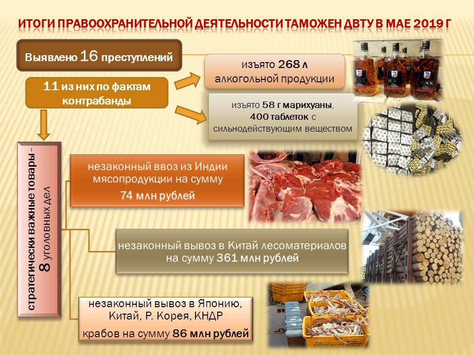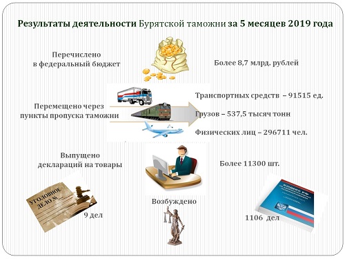 В отношении юридических, физических лиц и индивидуальных предпринимателей за 5 месяцев 2019 года было проведено 379 проверочных мероприятий (за аналогичный период 2018 года – 187). В перечень основных направлений таможенных проверок вошли: контроль достоверности заявления таможенной стоимости; проверки в отношении объектов интеллектуальной собственности при обороте товаров, ввезенных на таможенную территорию Евразийского экономического союза; контроль достоверности заявления кода товара в соответствии с Товарной номенклатурой внешнеэкономической деятельности Евразийского экономического союза. С начала года было взыскано 35,5 миллионов рублей, возбуждено 2 уголовных дела и 41 – об административных правонарушениях.