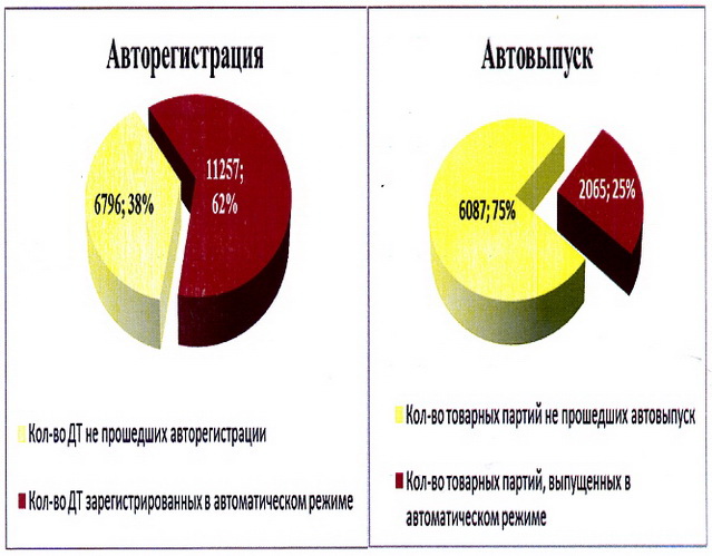 С начала года автоматическую регистрацию прошли 11 257 деклараций на товары (62 % от общего объема деклараций на товары). Доля автоматически зарегистрированных электронных экспортных деклараций (5511ДТ) составила 80%, доля автоматически зарегистрированных импортных деклараций (5746 ДТ) составила 51%. Время регистрации таких документов сократилось с одного часа, предусмотренного законодательством, до 1 - 2 минут.